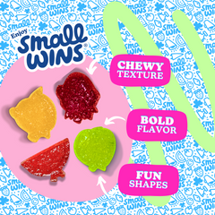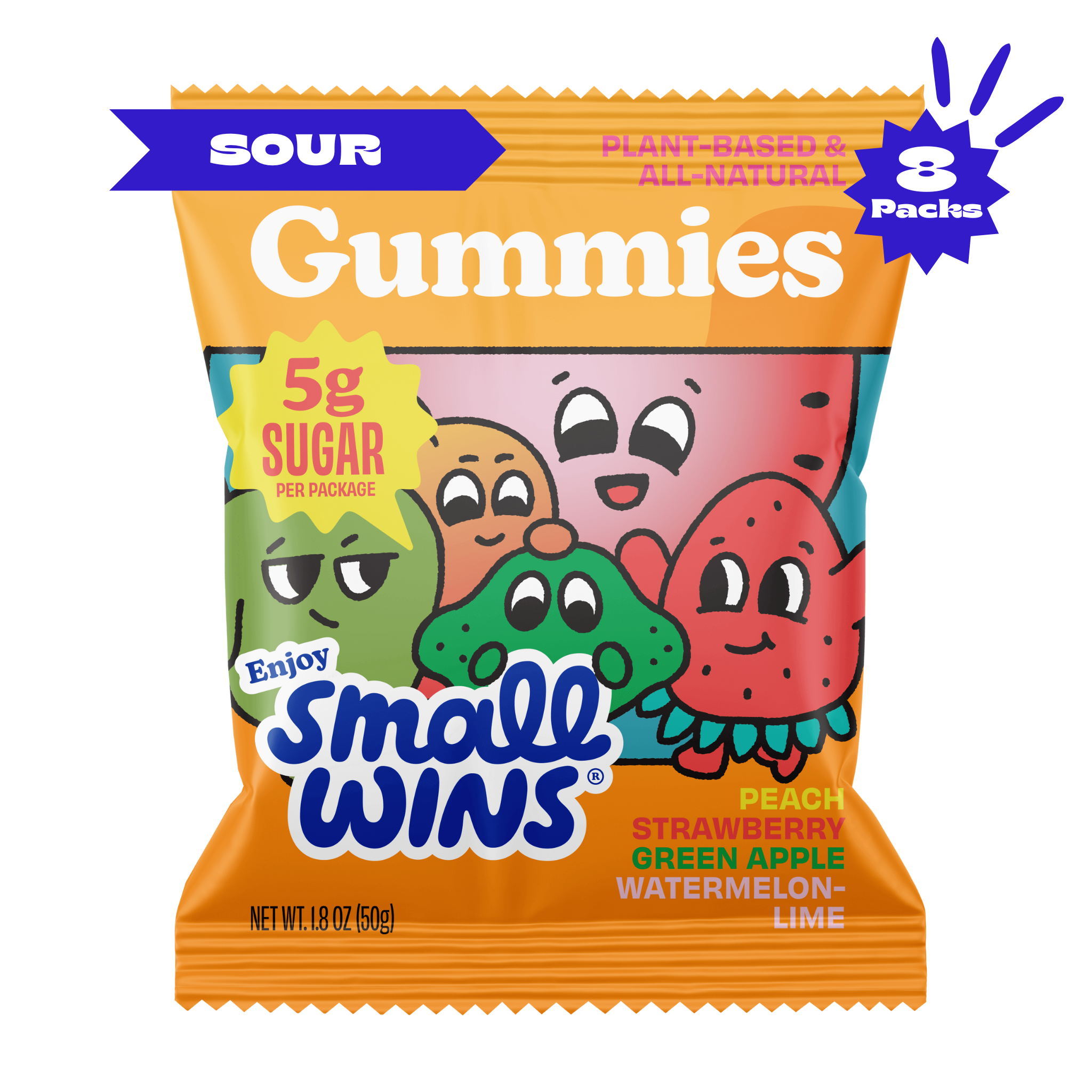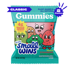 Enjoy Small Wins Gummies are the perfect treat to satisfy your sweet tooth without taking you on a sugar rollercoaster. With only 4 grams of sugar per package, you can enjoy candy and go about crushing your day. Strawberry, peach, green apple and watermelon-lime will add some zest to