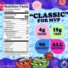 CLASSIC INGREDIENTS: Organic Tapioca Fiber, Organic Allulose, Organic IMO (vegetable source), Pectin, Organic Cane Sugar, Malic Acid, Organic Citric Acid, Organic Natural Apple Flavor, Organic Natural Strawberry Flavor, Sodium Citrate, Organic Natural Watermelon Flavor, Organic Colors (Fruit and Vegetable Juice, Turmeric, Spirulina Extract), Organic Natural Peach Flavor, Sodium Malate, Organic Vegetable Oil and Carnauba Wax, Monk Fruit Extract, Organic Natural Lime Flavor.