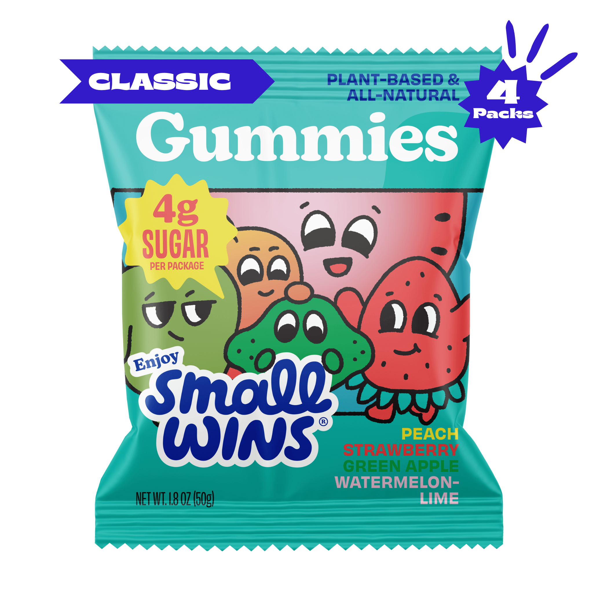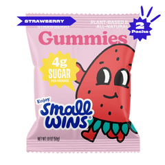 Enjoy Small Wins Gummies are the perfect treat to satisfy your sweet tooth without taking you on a sugar rollercoaster. With only 4/5 grams of sugar per package, you can enjoy candy and go about crushing your day. Strawberry, peach, green apple and watermelon-lime will add some zest to